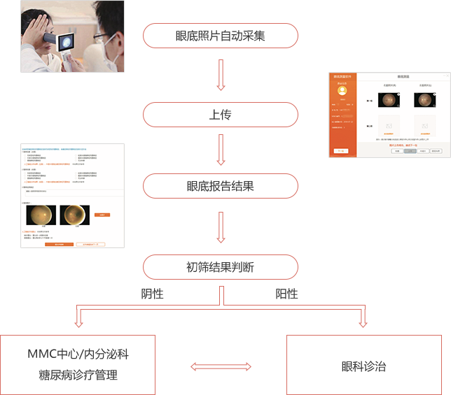 MMC糖尿病視網(wǎng)膜病變防控中心是標(biāo)準(zhǔn)化代謝性疾病管理中心(MMC)的一個分支項目。在各級醫(yī)療機(jī)構(gòu)中開展糖尿病視網(wǎng)膜病變篩查防治,通過采集眼底照片,利用AI自動化閱片技術(shù),依托MMC基于物聯(lián)網(wǎng)大數(shù)據(jù)的一站式、標(biāo)準(zhǔn)化代謝性疾病綜合管理平臺,最終實現(xiàn)糖網(wǎng)篩查和隨訪管理的目標(biāo)。